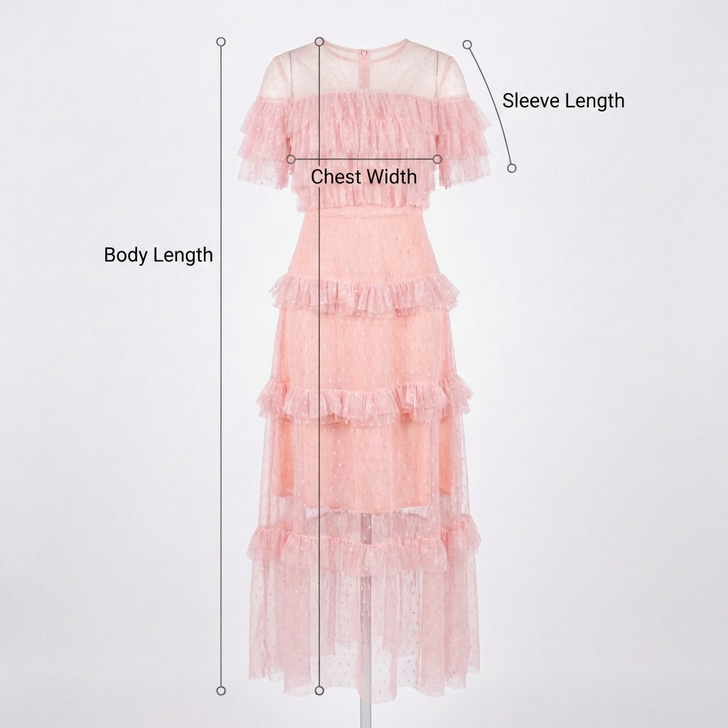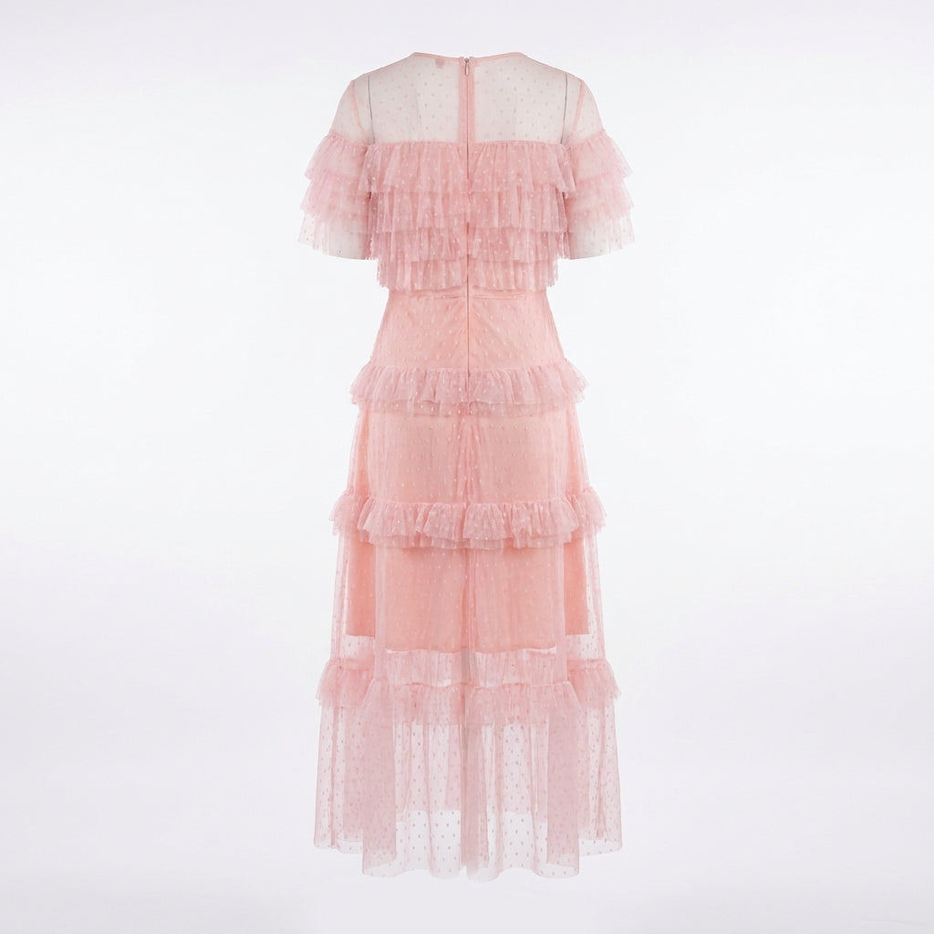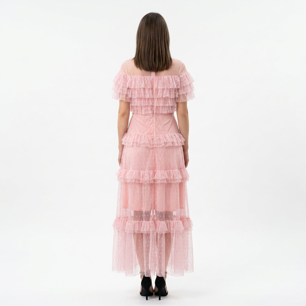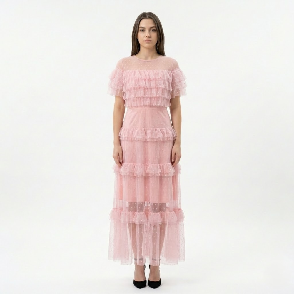 Długa sukienka o dopasowanej talii i rozkloszowanym dole z warstwowymi falbanami, podkreślająca sylwetkę i nadająca romantyczny charakter.